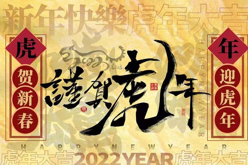 金牛辭歲寒風盡, 玉虎迎新春氣來。 騰霄宏圖今朝始, 輝華大業千秋盛。